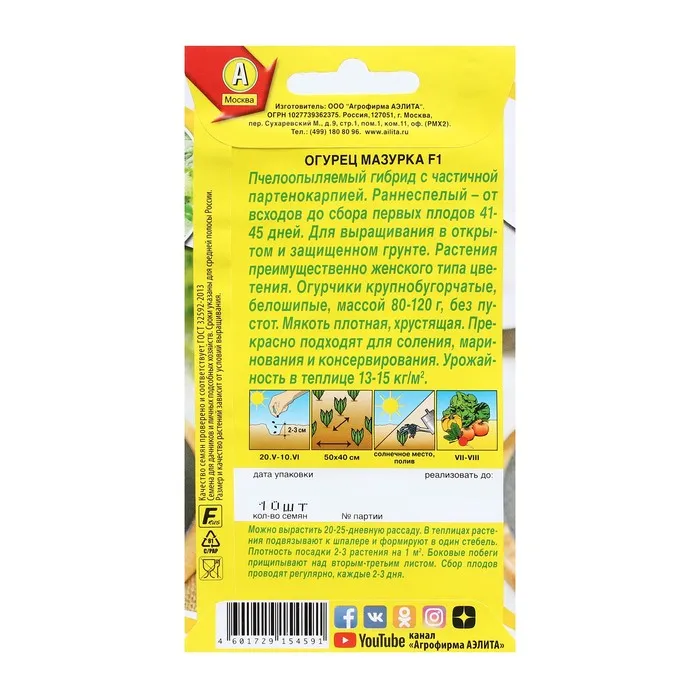 Посев на рассаду в начале мая, высадка 20-дневной рассады в грунт в конце мая - начале июня в фазе трех-четырех настоящих листьев. Посев в открытый грунт в конце мая, в бороздки на глубину 1,5-2 см. Шаг между бороздками 50 см, после прореживания на погонном метре оставляют 3-4 растения.Огурцы требуют высокоплодородных, нейтральных, дренированных, хорошо заправленных органикой почв.