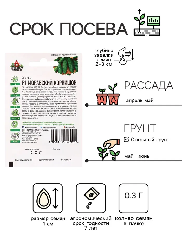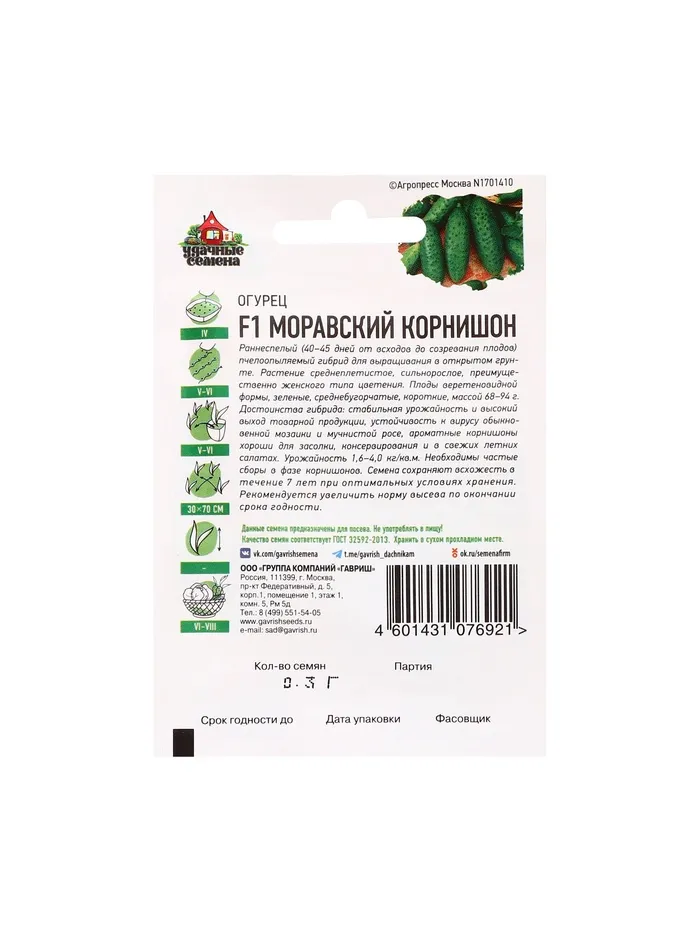 Раннеспелый (40-45 дней от всходов до созревания плодов) пчелоопыляемый сорт для выращивания в открытом грунте. Растение среднеплетистое, сильнорослое, преимущественно женского типа цветения. Плоды веретеновидной формы, зеленые, среднебугорчатые, короткие, массой 68-94 г. Достоинства сорта: стабильная урожайность и высокий выход товарной продукции, устойчивость к вирусу обыкновенной мозаики и мучнистой росе, ароматные корнишоны хороши для засолки, консервирования и в свежих летних салатах. Урожайность 1,6-4,0 кг/м2.Посев на рассаду в конце апреля. Высадка рассады в грунт в конце мая – начале июня в фазе 3-4-х настоящих листьев. Посев непосредственно в грунт – в мае – июне. Схема посадки: 30х70 см. Необходимы частые сборы в фазе корнишонов.