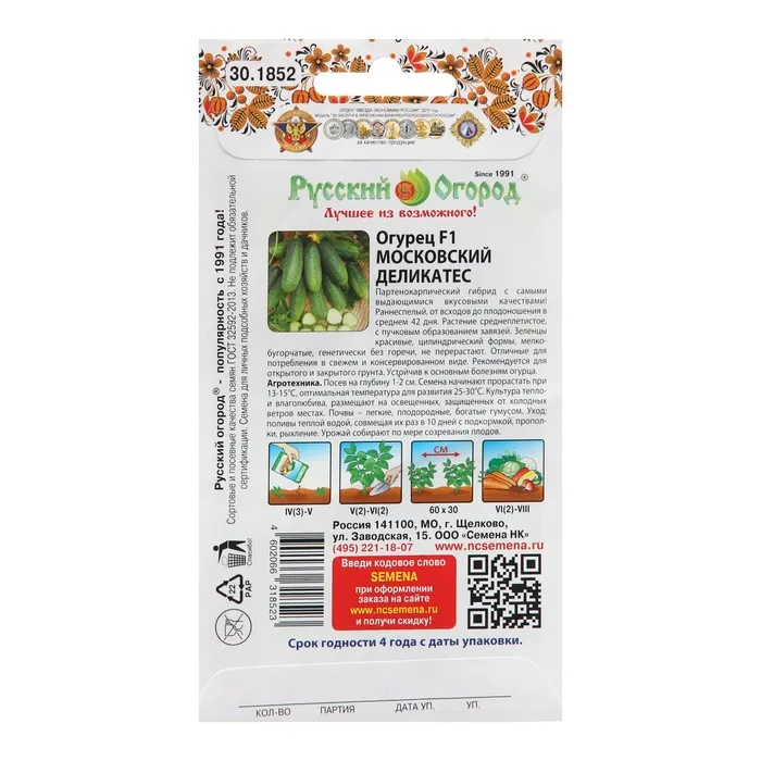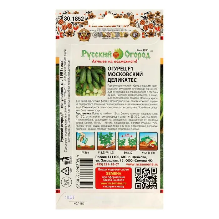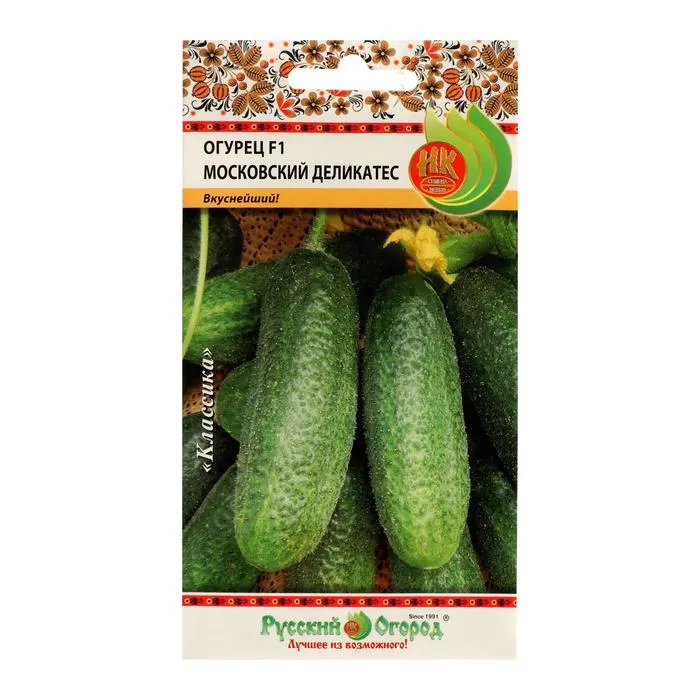 Огурец Московский Деликатес F1 - партенокарпический раннеспелый (42 дня) гибрид. Очень вкусный, красивый, заслуживший искренние восторги со стороны многих наших клиентов! Растение среднеплетистое, с пучковым образованием завязей. Зеленцы красивые, цилиндрической формы, мелкобугорчатые, генетически без горечи, а также они не перерастают. Огурчики хороши в свежем и консервированном виде. Рекомендуется как для открытого, так и для защищенного грунта. Отличается высокой урожайностью и товарностью, устойчив к основным болезням.