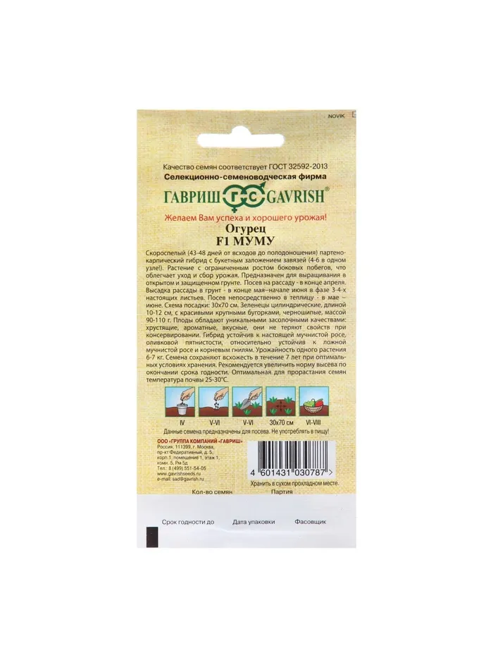 Скороспелый (43-48 дней от всходов до плодоношения) партенокарпический гибрид с букетным заложением завязей (4-6 в одном узле!). Растение с ограниченным ростом боковых побегов, что облегчает уход и сбор урожая. Предназначен для выращивания в открытом и защищенном грунте, а также под временными пленочными укрытиями. Посев на рассаду в конце апреля. Высадка рассады в грунт в конце мая – начале июня в фазе 3-4-х настоящих листьев. Посев непосредственно в грунт – в мае – июне. Схема посадки 30х70 см. Зеленцы цилиндрические, длиной 10-12 см, с красивыми крупными бугорками, черношипые, массой 90-110 г. Плоды обладают уникальными засолочными качествами: хрустящие, ароматные, вкусные, они не теряют своих свойств при консервировании. Гибрид устойчив к настоящей мучнистой росе, оливковой пятнистости, относительно устойчив к ложной мучнистой росе и корневым гнилям. Урожайность — 6-7 кг/раст.