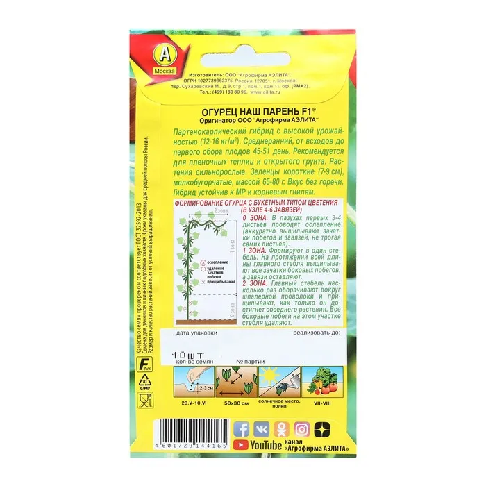 Среднеранний партенокарпический гибрид с высокой урожайностью (12-16 кг/м2). Период от всходов до первого сбора плодов 45-51 день. Для получения максимального урожая рекомендуется выращивать под пленочными укрытиями, но подходит и для открытого грунта. Растения сильнорослые, женского типа цветения, с пучковым образованием завязей. Зеленцы цилиндрические, короткие (7-9 см), массой 60-90 г, мелкобугорчатые, с белым опушением, на поперечном разрезе округлые. Огурчики замечательного вкуса, не горчат. Отлично подходят для консервирования в небольших банках. Гибрид устойчив к мучнистой росе и корневым гнилям. Урожайность – 13-16 кг/м2.