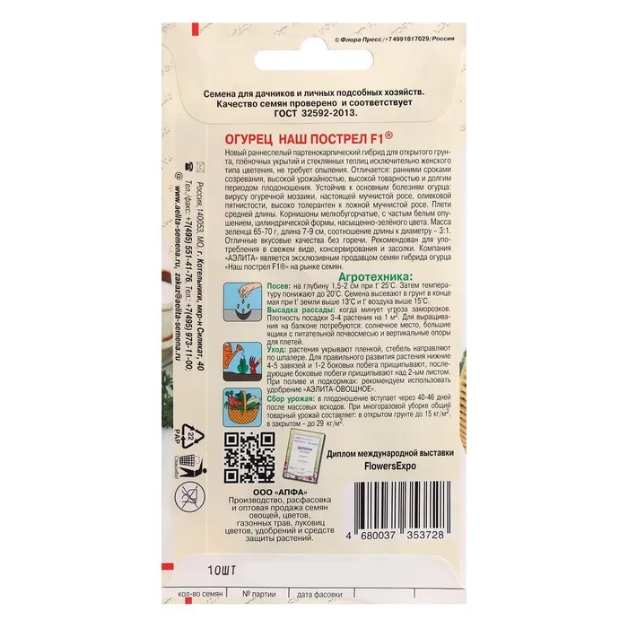 Партенокарпический гибрид для выращивания в открытом и защищенном грунте. Очень ранний (38-42 дн. от всх.). Растение мощное, хорошо облиственное, женского типа цветения, с пучковым расположением завязей (до 3-х в узле). Плоды красивого зеленого цвета с короткими неяркими светлыми полосами, ровные, цилиндрические, среднечастобугорчатые, белошипые, длиной 8-10 см. Мякоть плотная, светло - зеленая, ароматная, хрустящая. Ценность гибрида: высокая урожайность и качество плодов, устойчивость к комплексу заболеваний, отменные вкусовые качества. Пригоден для свежего потребления и консервирования.Посев: на рассаду - в последней декаде апреля-начале мая в горшочки. Температурный режим : во время прорастания 23-25 С, после появления всходов — 18-20 С.Размещение на постоянном месте: высадка 25-30 дн. рассадой по 3 раст/м2 или прямой посев в грунт на глубину 1,5-2 см в хорошо прогретую, богатую органикой почву, после окончания угрозы весенних заморозков.Уход: в открытом грунте не формируют. В теплицах выращивают на шпалере. Для получения более ранней продукции побеги в нижних 5 междоузлиях прищипывают на один плод и лист. Затем прищипывают боковые побеги до высоты 1-1,2 м. Далее растение не формируют. Рекомендуются обильные регулярные поливы отстоявшейся водой ежедневно, подкормки минеральными и органическими удобрениями.Сбор урожая: собирают через день в открытом грунте и ежедневно в теплицах. Нерегулярные сборы снижают урожайность и качество зеленцов.