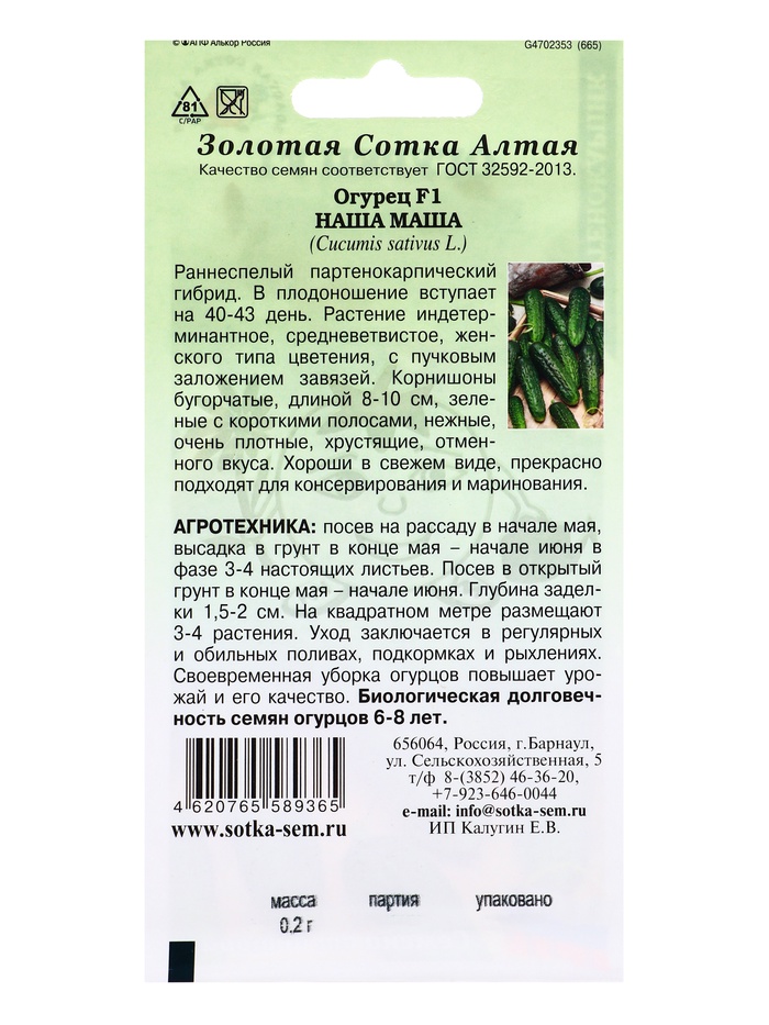 Семена Огурец «Наша Маша», F1, 0.2 г, партенокарпический, раннеспелый, «Золотая Сотка Алтая» — Характеристики