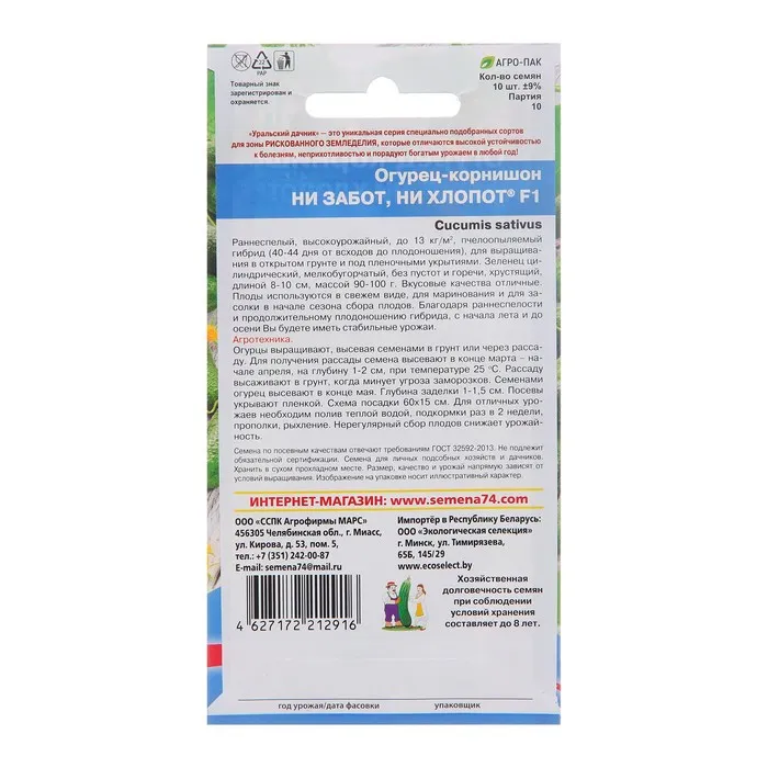Агротехника: огурцы выращивают, высевая семенами в грунт или через рассаду. Для получения рассады семена высевают в конце марта - начале апреля, на глубину 1-2 см, при температуре 25 °С. Рассаду высаживают в грунт, когда минует угроза заморозков. Семенами огурец высевают в конце мая. Глубина заделки 1-1,5 см. Посевы укрывают пленкой. Схема посадки 60х15 см. Для отличных урожаев необходим полив теплой водой, подкормки раз в 2 недели, прополки, рыхление. Нерегулярный сбор плодов снижает урожайность.