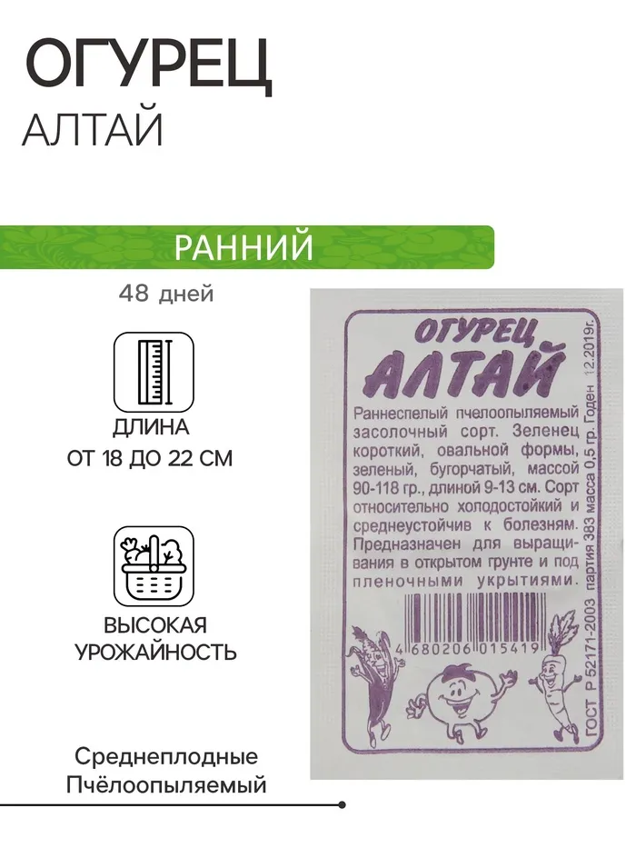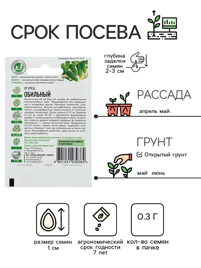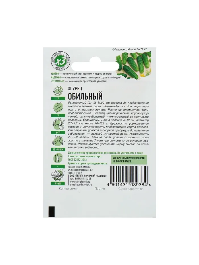 Семена Огурец "Обильный", раннеспелый, пчелоопыляемый, 0,3 г серия ХИТ х3 — Характеристики