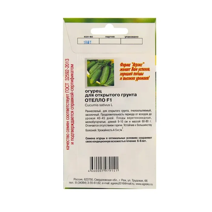 Огурец Отелло F1 - ранний пчелоопыляемый гибрид для открытого грунта корнишонного типа. Период от полных всходов до начала плодоношения 41–45 дней. Растение среднерослое. Огурец цилиндрический, зеленого цвета, мелкобугорчатый, длиной 8–10 см, массой 70–80 г, белошипый, генетически без горечи. В одном узле формируется 3–4 плода (пучковое плодоношение). Гибрид огурца Отелло F1 отличается отличным вкусом и товарными качествами, транспортабельностью, выровненностью корнишонов. Огурец Отелло F1 устойчив к мучнистой (Px) и ложной мучнистой росе (Pcu), кладоспориозу (Ccu), вирусу огуречной мозаики (CMV-1) и относительно устойчив к неблагоприятным факторам окружающей среды. Отелло F1 - прекрасный сорт огурца для консервирования и для употребления в свежем виде. Рекомендуемая схема посадки 70х30 см. Растения этого гибрида огурца можно выращивать в расстил на грядах или с подвязкой к опоре. Урожайность 8–10 кг/м2.