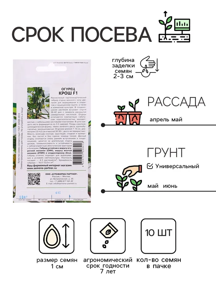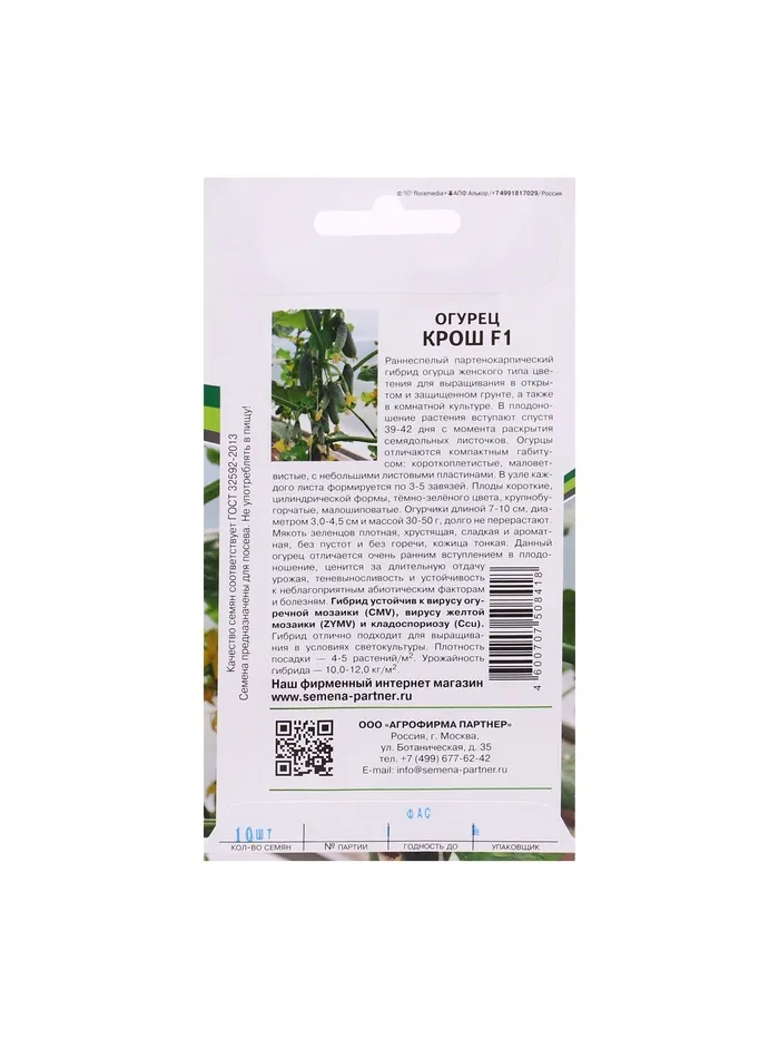 Раннеспелый партенокарпический гибрид огурца женского типа цветения для выращивания в открытом и защищенном грунте, а также в комнатной культуре. В плодоношение растения вступают спустя 39-42 дня с момента всходов. Огурцы отличаются компактным габитусом: короткоплетистые, маловетвистые, с небольшими листовыми пластинами. В узле каждого листа формируется по 3-5 завязей. Плоды короткие, цилиндрической формы, тёмно-зелёного цвета, крупнобугорчатые, малошиповатые. Огурчики длиной 7-10 см, диаметром 3,0-4,5 см и массой 30-50 г, долго не перерастают. Мякоть зеленцов плотная, хрустящая, сладкая и ароматная, без пустот и без горечи, кожица тонкая. Данный огурец отличается очень ранним вступлением в плодоношение, ценится за длительную отдачу урожая, теневыносливость и устойчивость к неблагоприятным абиотическим факторам и болезням. Гибрид устойчив к вирусу огуречной мозаики (CMV), вирусу желтой мозаики (ZYMV) и кладоспориозу (Ccu). Гибрид отлично подходит для выращивания в условиях светокультуры. Плотность посадки — 4-5 растений/м². Урожайность гибрида — 10,0-12,0 кг/м².