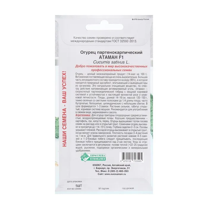 Высокая продуктивность, технологичность и отличные товарные качества зеленцов нового гибрида огурца Атаман позволяет рекомендовать его для выращивания в защищенном грунте в те же сроки, что и гибрид F1 Кураж.