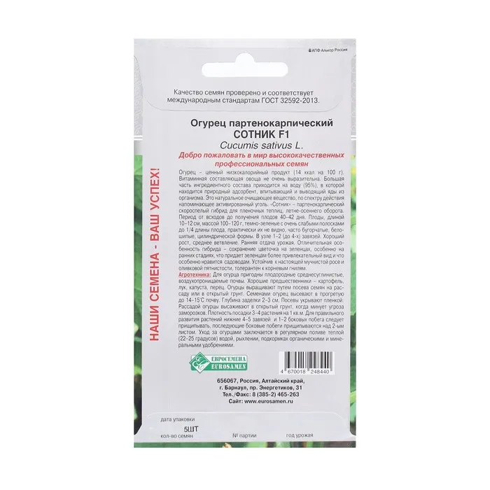 «Сотник» -партенокарпический скороспелый гибрид для пленочных теплиц, летне-осеннего оборота. Период от всходов до получения плодов 40-42 дня. Плоды, длиной 10-12 см, массой 100-120 г, темно-зеленые с очень слабыми полосками до 1/4 длины плода, практически их не видно, часто бугорчатые, белошипые, цилиндрической формы. В узле 1-2 (до 4-х) завязей. Хороший рост, среднее ветвление. Ранняя отдача урожая. Отличительная особенность гибрида – сохранение цветочка на зеленцах, особенно на ранних стадиях, что придает зеленцам более привлекательный вид и что особенно нравится садоводам. Устойчив к настоящей мучнистой росе и оливковой пятнистости, толерантен к корневым гнилям.