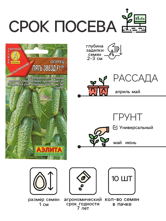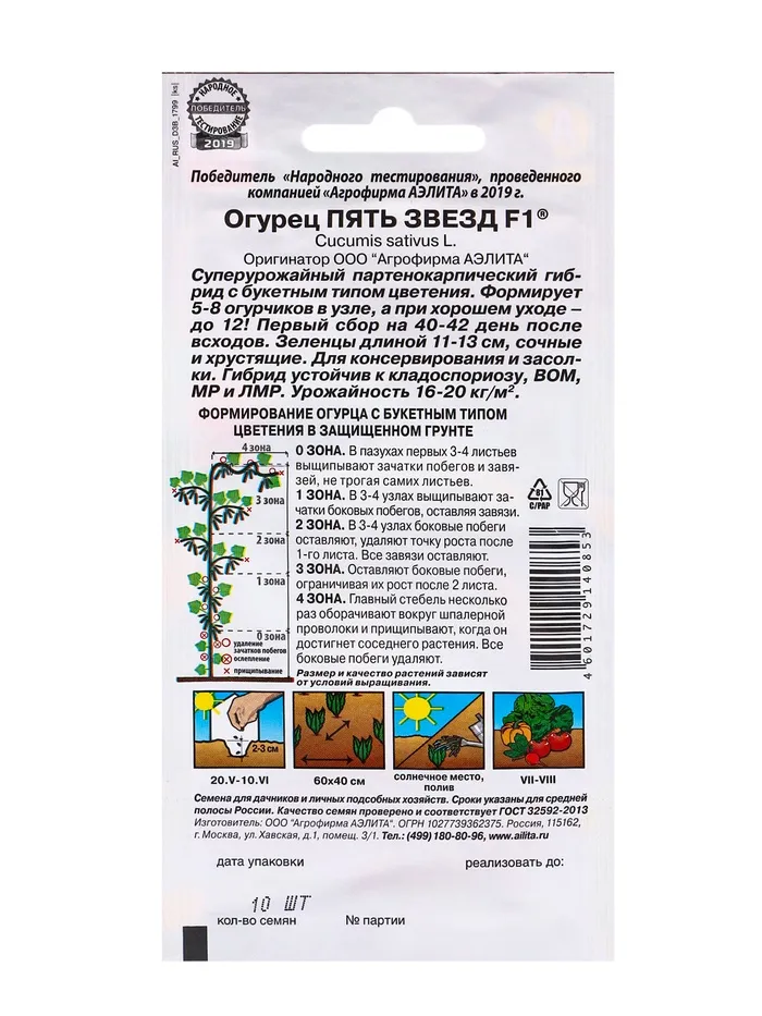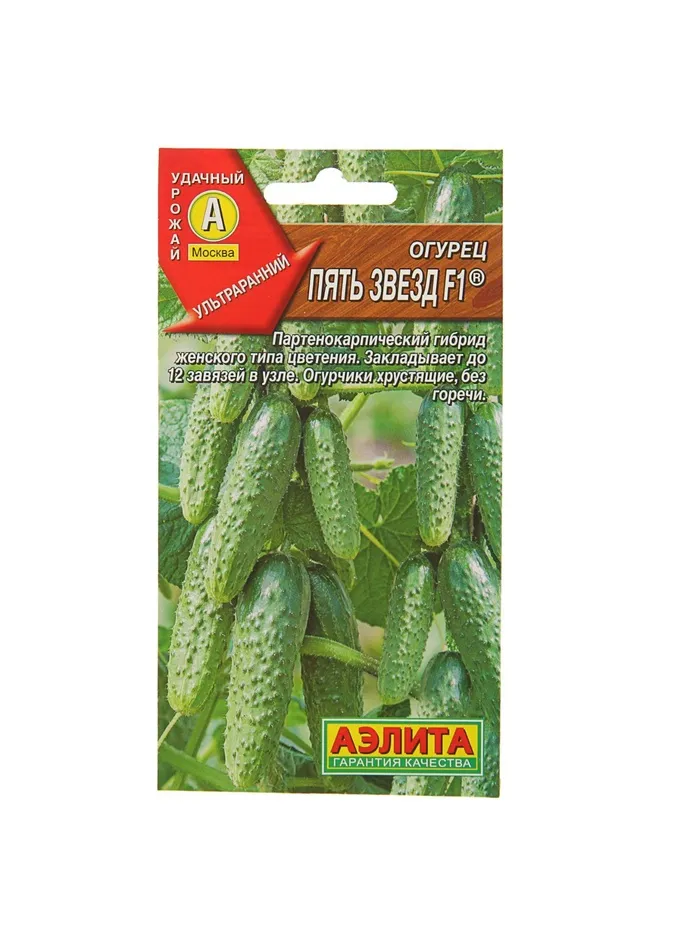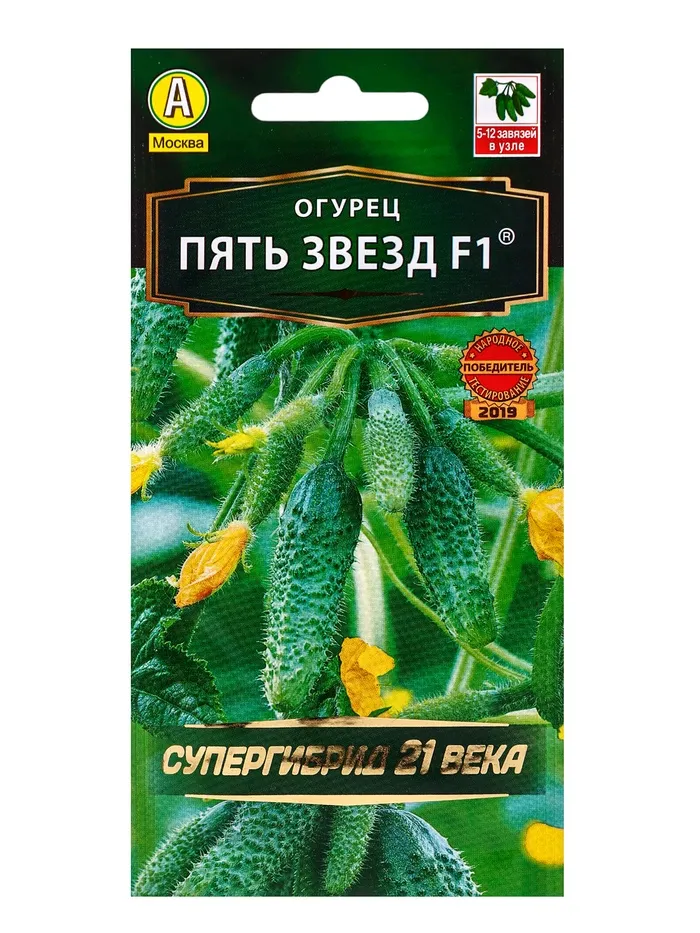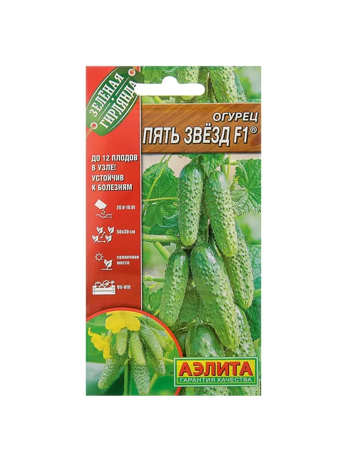 «Пять звёзд» — гибридный сорт. Предназначен для выращивания в открытом грунте и под плёночными укрытиями. Растение цветёт по женскому типу и образует хрустящие сочные плоды без горечи. Гибрид устойчив к болезням культуры.