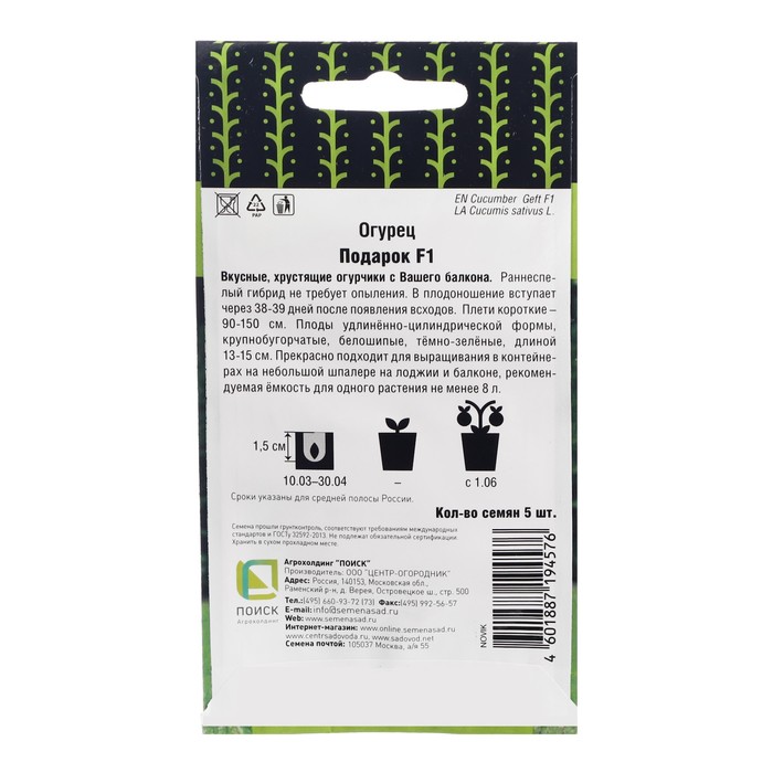 Вкусные, хрустящие огурчики с Вашего балкона. Раннеспелый гибрид не требует опыления. В плодоношение вступает через 38-39 дней после появления всходов. Плети короткие 90-150 см. Плоды удлинённо-цилиндрической формы, крупнобугорчатые, белошипые, тёмно-зелёные, длиной 13-15 см. Прекрасно подходит для выращивания в контейнерах на небольшой шпалере на лоджии и балконе, рекомендуемая ёмкость для одного растения не менее 8 л.