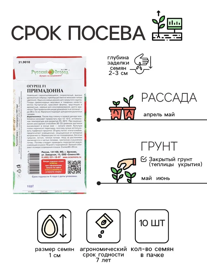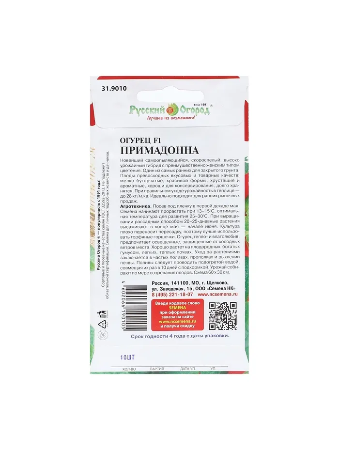 Раннеспелый (35-45 дней) партенокарпический гибрид для открытого грунта и пленочных укрытий. Растение сильнорослое, сильноплетистое, с женским типом цветения и пучковым формированием завязей, по 3-4 (до 6-9) в узле. Зеленцы короткие, цилиндрические, мелкобугорчатые, темно-зеленые, с белым опушением, длиной 10-12 см, массой 85-110 г, плотные, без горечи. Урожайность в теплице до 25-28 кг/м². Ценность гибрида: комплексная устойчивость к болезням и перепадам температур, обильная и дружная отдача урожая, продолжительный период плодоношения, подходит для длительной транспортировки, долго сохраняет товарный вид, при обработке не образуются пустоты и сохраняется цвет. Можно выращивать на окне и балконе. Назначение универсальное.