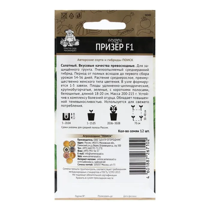 Салатный. Вкусовые качества превосходные. Для защищённого грунта. Пчелоопыляемый среднеранний гибрид. Период от полных всходов до первого сбора урожая 54-56 дней. Растение среднерослое, преимущественно женского типа цветения. В узле формируется 1-3 завязи. Плоды удлиненно-цилиндрические, крупнобугорчатые, зеленые, с короткими полосами, белошипые, длиной 18-20 см. Масса 200-215 г. Устойчив к комплексу болезней огурца. Обладает повышенной теневыносливостью. Используется для свежего потребления.