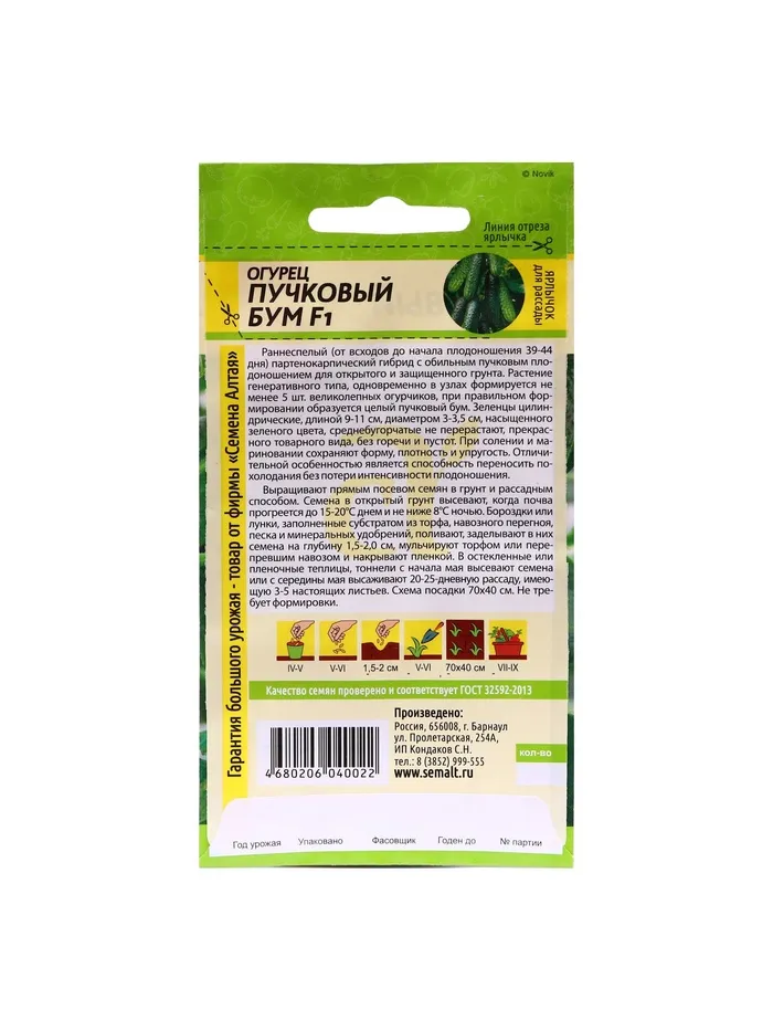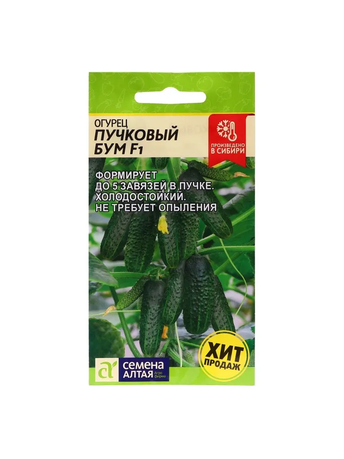 Раннеспелый (от всходов до начала плодоношения 39-44 дня) партенокарпический гибрид с обильным пучковым плодоношением для открытого и защищенного грунта. Растение генеративного типа, одновременно в узлах формируется не менее 5 шт. великолепных огурчиков, при правильном формировании образуется целый пучковый бум. Зеленцы цилиндрические, длиной 9-11 см, диаметром 3-3,5 см, насыщенного зелёного цвета, среднебугорчатые не перерастают, прекрасного товарного вида, без горечи и пустот. При солении и мариновании сохраняют форму, плотность и упругость. Отличительной особенностью является способность переносить похолодания без потери интенсивности плодоношения.