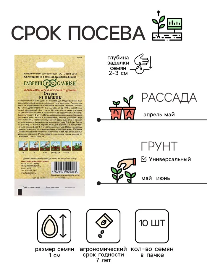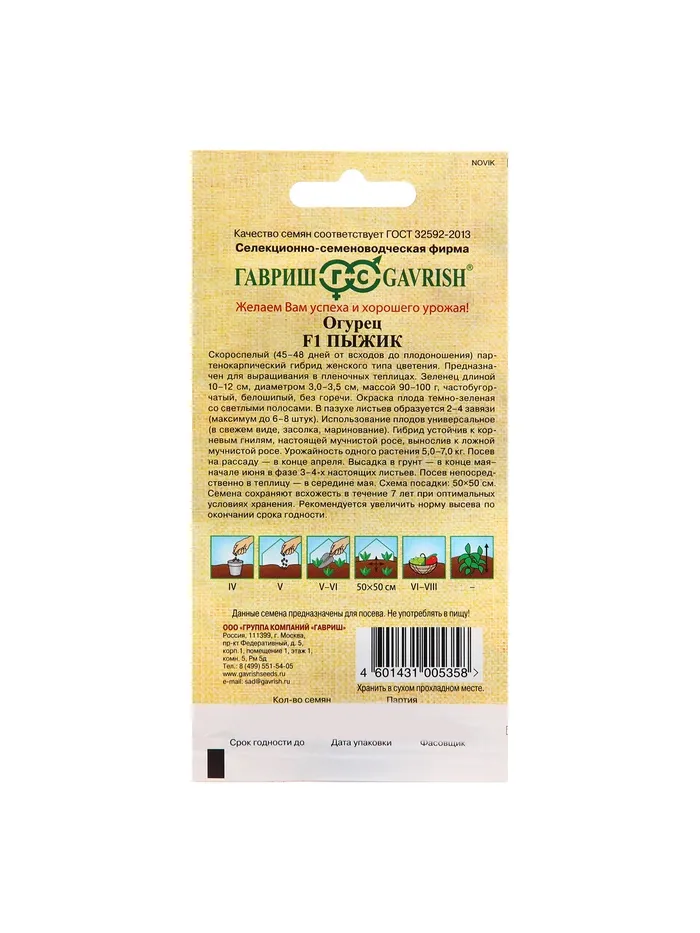 Новый скороспелый партенокарпический гибрид огурца (45-48 дней от всходов до плодоношения), женского типа цветения, предназначен для выращивания в пленочных теплицах. Растение сильнорослое, длина главного побега до 3,0-3,5 м. В узлах формируется по 2-4 завязи (до 6-8 штук). Зеленец длиной 10-12 см, диаметром 3,0-3,5 см, массой 90-110 г, бугорчатый. Окраска плода темно-зеленая со светлыми полосами, белошипый. Вкусовые качества плодов высокие, использование универсальное. Гибрид устойчив к корневым гнилям, настоящей мучнистой росе, вынослив к ложной мучнистой росе. Плотность посадки 2,5-3,0 раст/м2. Урожайность 5,0-7,0 кг/растение