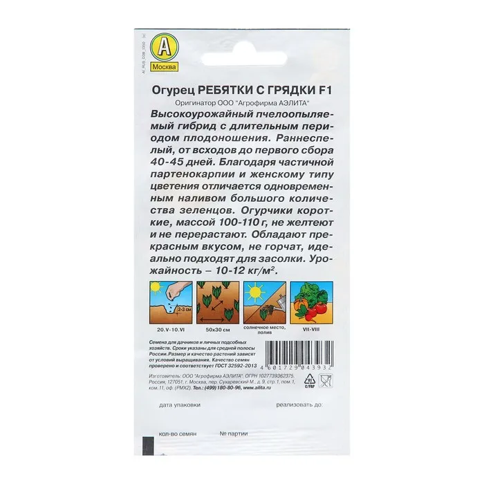 Семена Огурец Ребятки с грядки F1 Ор. А Пч Ц/П 10шт — Характеристики
