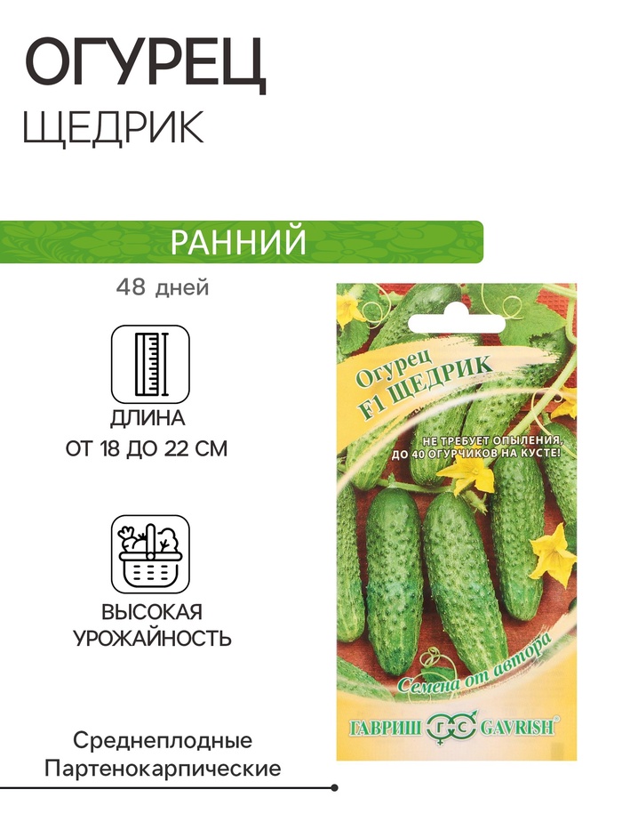 Ранний партенокорпический гибрид, от всходов до начала плодоношения 40-44 дня. Растение сбалансированное, слабоветвистое, с ограниченным ростом боковых побегов, женского типа цветения, в узле по 2-3 завязи. Плод цилиндрический, гладкий, зеленый, длиной 10-12 см, диаметром 3,5-4 см, массой 90-120 г. Мякоть плотная, сочная хрустящая. Вкусовые качества отличные. Урожайность в пленочных теплицах до 10 кг/м2. Гибрид жаростойкий, обладает комплексной устойчивостью к заболеваниям и устойчивостью корневой системы к засолению грунта. Характеризуется ранним и обильным плодоношением (особенно в первые недели сбора урожая), плоды выравненные, транспортабельные, отличных вкусовых качеств, исключительно ароматные. Салатного назначения. Рекомендован для выращивания в пленочных теплицах и в открытом грунте.