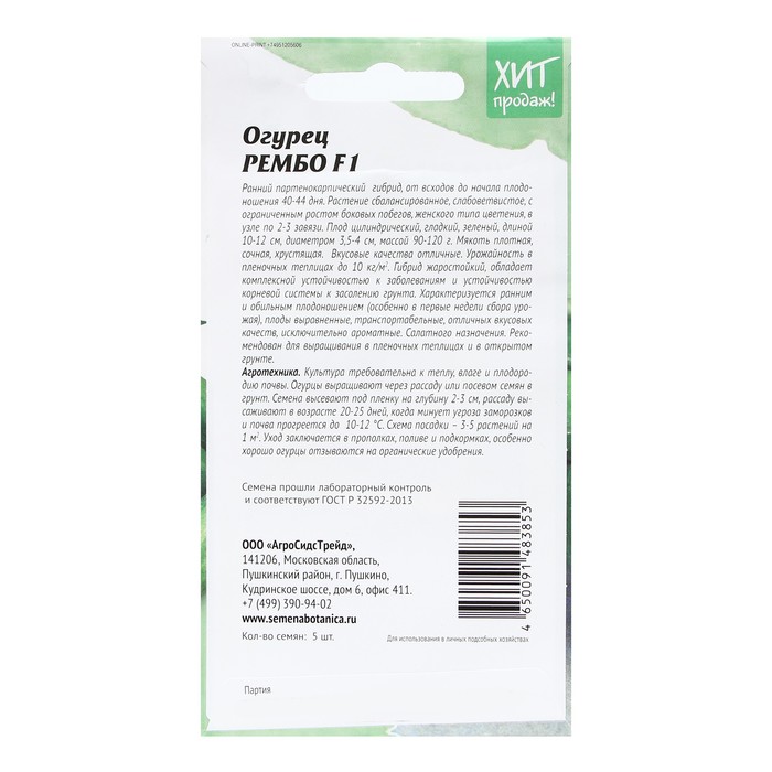 Агротехника: культура требовательна к теплу, влаге и плодородию почвы. Огурцы выращивают через рассаду или посевом семян в грунт. Семена высеивают под пленку на глубину 2-3 см, рассаду высаживают в возрасте 20-25 дней, когда минует угроза заморозков и почва прогреется до 10-12 С. Схема посадки 3-5 растений на 1 м2. Уход заключается в прополках, поливе и подкормах, особенно хорошо огурцы отзываются на органические удобрения.