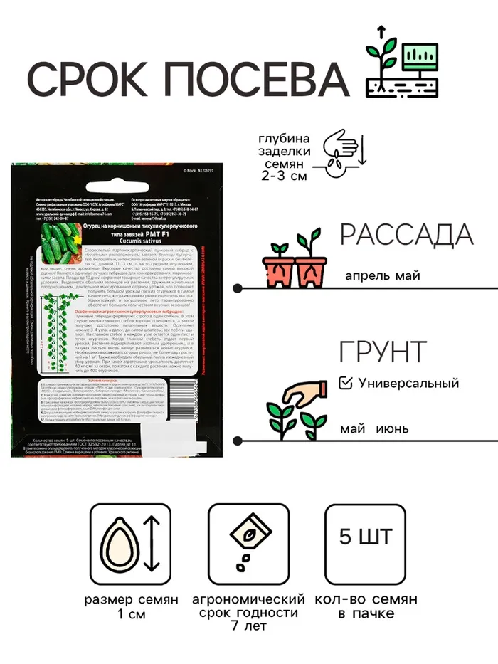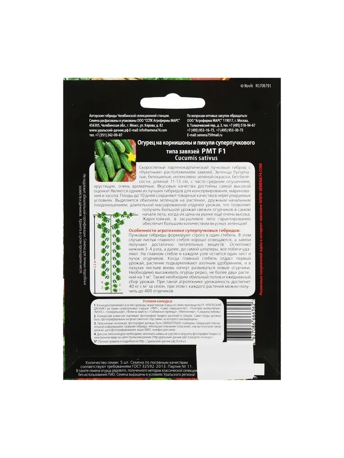 Семена Огурец "РМТ" F1 супербукетный тип, партенокарпический, 5 шт — Характеристики