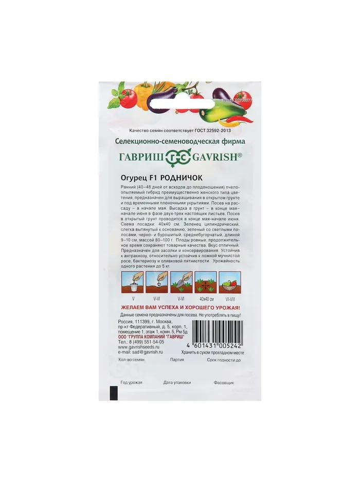 Семена Огурец Родничок F1. Среднеранний (от всходов до плодоношения 40-48 дней) пчелоопыляемый гибрид преимущественно женского типа цветения, предназначен для выращивания в открытом грунте и под временными пленочными укрытиями. Зеленец цилиндрический, слегка вытянутый к основанию, зеленый со светлыми полосами, черно- и буро-шипый, среднебугорчатый, длиной 9-10 см, массой 80-100 г. Плоды выровнены по форме и продолжительное время сохраняют товарные качества. Вкусовые качества отличные. Пригоден для засолки и консервирования. Плотность посадки 4-5 раст./м2. Урожайность до 5 кг/раст.