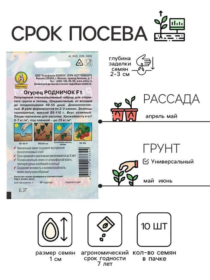Семена Огурец "Родничок" F1, среднеспелый, пчелоопыляемый, 10 шт — Характеристики