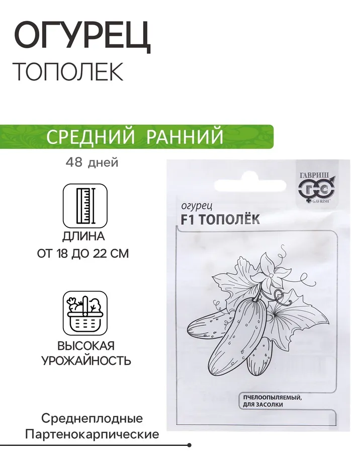 Зеленцы очень привлекательные, выровненные, 8-10 см, темно-зеленые, мелкобугорчатые, с густым, нежным опушением, хрустящие. Благодаря высокой плотности мякоти и нежной кожице - не образуют пустот. Генетически без горечи. Обладает высокой потенциальной урожайностью, что позволяет использовать гибрид для открытого грунта и временных пленочных укрытий. Устойчив к комплексу болезней и стрессовым условиям.