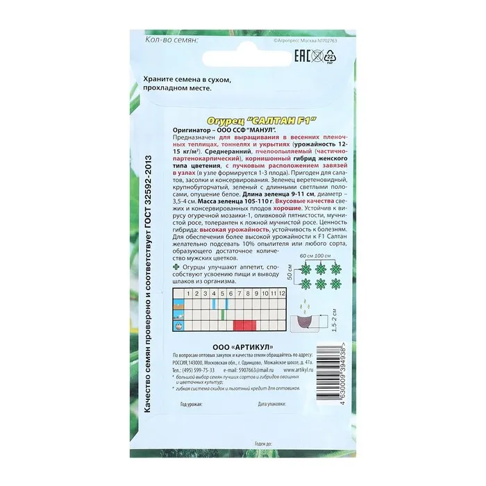 Урожайный, скороспелый, частично-партенокарпический пучковый корнишонный гибрид женского типа цветения. Предназначен для открытого грунта, тоннелей, весенних теплиц. Холодостойкий, ветвление активное. Зеленцы крупнобугорчатые, белошипые, с частым опушением, длиной 9-11 см. Засолочные и вкусовые качества очень высокие. Гибрид устойчив к мучнистой росе, оливковой пятнистости, вирусу обыкновенной огуречной мозаики, толерантен к ложной мучнистой росе. Для получения более высокого урожая к F1 Салтан подсевают 10 % опылителя. Плотность посадки в открытом грунте 3-4 раст./м2, в теплицах 2,5 раст./м2.
