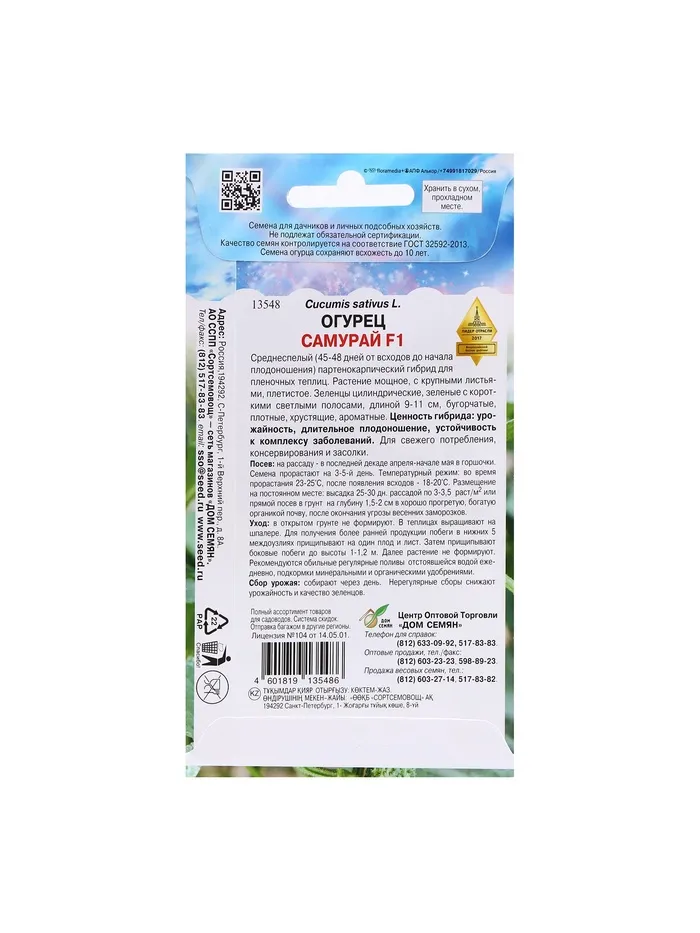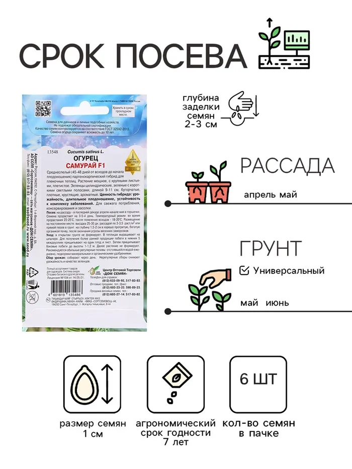 Раннеспелый, 100% партенокарпический (не требует опыления) гибрид.Завязь букетная, в пазухе 3-4 завязи. Зеленец длиной 5-6 см, цилиндрической формы, крупнобугорчатый, расположение бугорков частое, белошипый, темно-зеленый с короткими светлыми полосами. Консистенция плотная, хрустящая.Для регионов с прохладным климатом необходим рассадный способ выращивания. Семена высевают в горшочки диаметром 10 см со специально подготовленной почвой (2 части перегноя, 1 часть дерновой земли, 1 часть песка) на глубину 1,5 см. Температура воздуха и почвы должна быть 20-23°С. Грунт равномерно увлажняют (не допускается перелив и закисание почвы). После появления всходов, в процессе роста растений, не допускать снижение температуры ниже 14°С. Сделать 1-2 подкормки полным минеральным удобрением с преобладанием азота. Рассада высаживается, когда минует угроза заморозков.