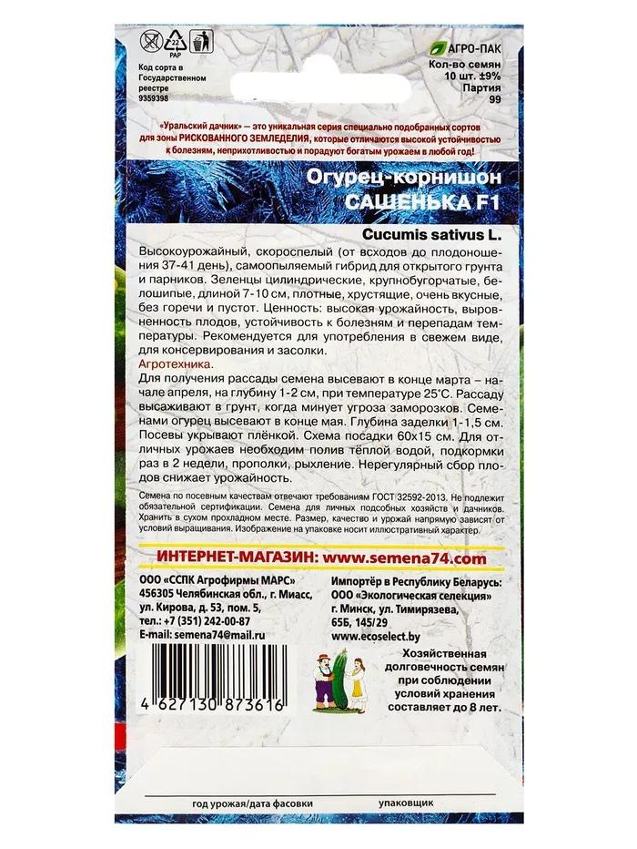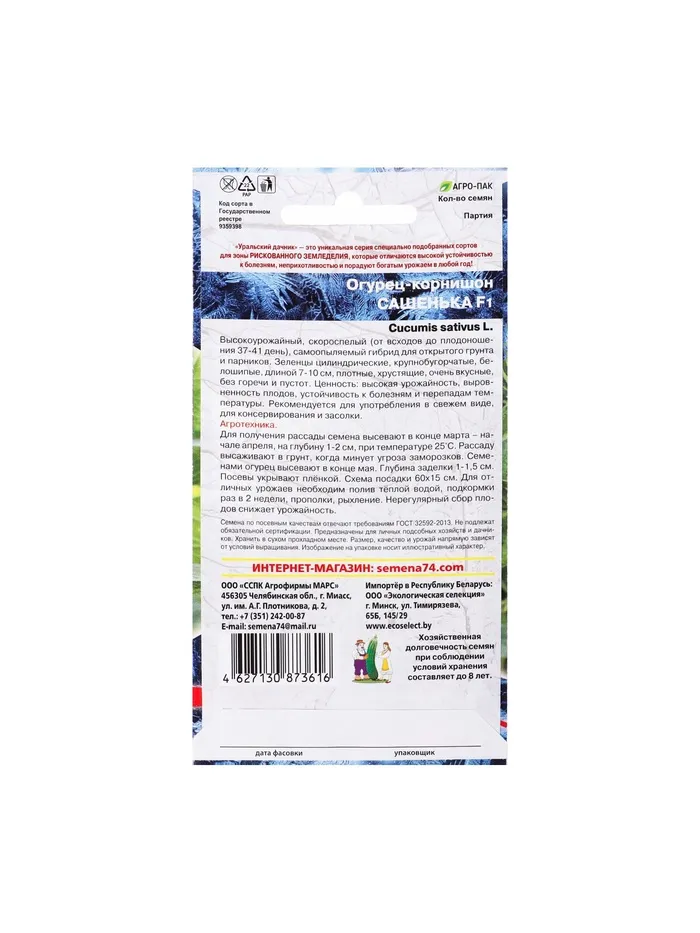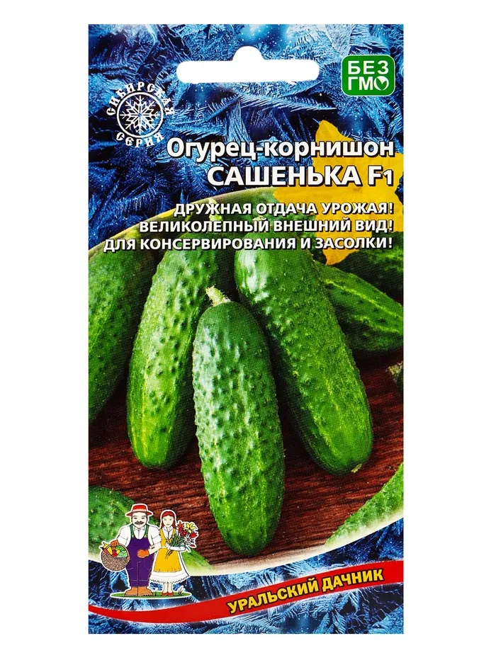 Высокоурожайный скороспелый (от всходов до плодоношения 37-41день) самоопыляемый гибрид для открытого грунта и парников. Зеленцы цилиндрические, крупнобугорчатые, белошипые, длиной 7-10 см, плотные, хрустящие, очень вкусные, без горечи и пустот. Ценность: высокая урожайность, выровненность плодов, устойчивость к болезням и перепадам температуры. Рекомендуется для получения рассады семена высевают в конце марта-начале апреля на глубину 1-2 см при температуре 25 °С. Рассаду высаживают в грунт, когда минует угроза заморозков. Семена огурца высевают в конце мая. Глубина заделки 1-1,5 см. Посевы укрывают пленкой. Схема посадки 60х15 см. Для отличных урожаев необходим полив теплой водой, подкормки раз в 2 недели, прополки, рыхление. Нерегулярный сбор плодов снижает урожайность.