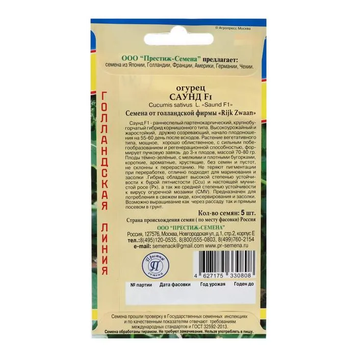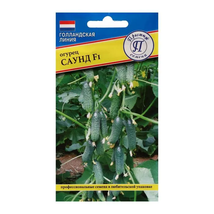 Саунд F1- раннеспелый партенокарпический, крупнобугорчатый гибрид корнишонного типа. Высокоурожайный и жаростойкий, дружно созревающий, начало плодоношения на 55-60 день после всходов. Растение вегетативного типа, мощное, хорошо облиственное, с сильным побегообразованием и регенерационной способностью, формирует пучковую завязь до 3-х плодов, массой 70-80 гр. Плоды тёмно-зелёные, с мелкими и плотными бугорками, короткие, ароматные, хрустящие, без семян и пустот, не склонны к перерастанию. Не теряют пигментации при переработке, отлично подходят для маринования и засолки .Гибрид обладает высокой степенью устойчивости к бурой пятнистости (Ccu) и настоящей мучнистой росе (Px), а так же средней степенью устойчивости к вирусу огуречной мозаики (CMV). Предназначен для потребления в свежем виде, консервирования и засолки.