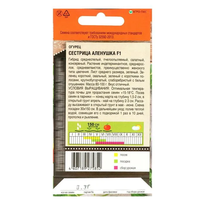 Вас порадует урожай тонкокожих плодов. Для открытого грунта. Среднеспелый высокоурожайный пчелоопыляемый гибрид. В плодоношение вступает через 52 дня после появления всходов. Растение среднерослое, средневетвистое, преимущественно женского типа цветения. Плод короткий, овальный, зеленый с короткими полосками, крупнобугорчатый, слаборебристый, опушение белое. Масса 80-100 г. Универсальное использование. Отличительная особенность – повышенная устойчивость к комплексу заболеваний. Рассаду начинают готовить в марте. Перед этим семена обрабатывают марганцовкой и закаляют. Это позволяет в дальнейшем избежать заболеваний. В субстрат семя помещают на глубину 1-2 см. До появления всходов грунт накрыть пленкой. Подходит для теплиц, открытого и защищенного пленкой грунта. Кислые почвы перед посадкой растения известковать. Схема посадки 70*30 см. Наилучшее время переносить рассаду на грунт – конец мая, начало июня. В это время почва уже хорошо прогрета, угроза заморозков минимальная.