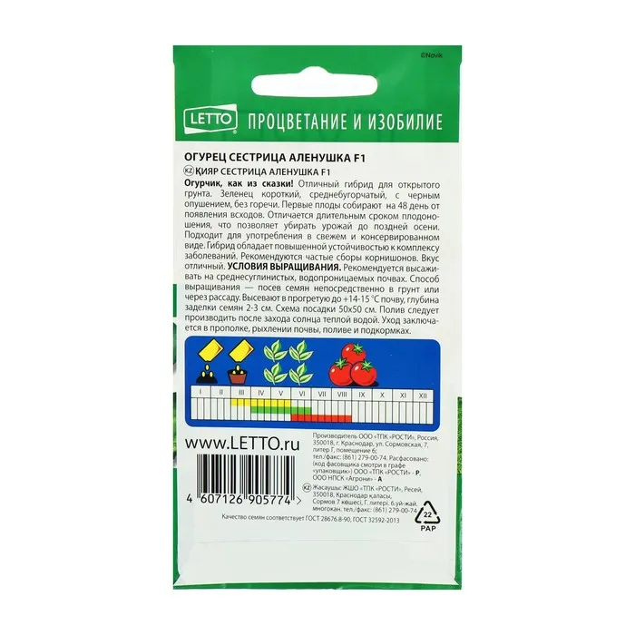 Семена Огурец Сестрица Аленушка F1, ранний, пчелоопыляемый, 0,3 гр — Характеристики
