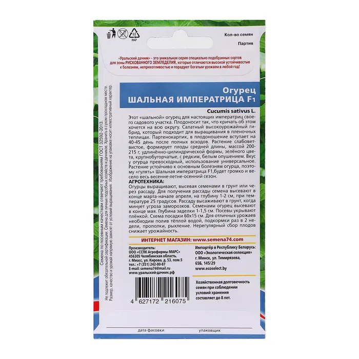 Огурцы выращивают, высевая семенами в грунт или через рассаду. Для получения рассады семена высевают в конце марта-начале апреля, на глубину 1-2 см, при температуре 25 градусов. Рассаду высаживают в грунт, когда минует угроза заморозков. Семенами огурец высевают в конце мая. Глубина заделки 1-1,5 см. Посевы укрывают плёнкой. Схема посадки 60х15 см. Для отличных урожаев необходим полив тёплой водой, подкормки раз в 2 недели, прополки, рыхление. Нерегулярный сбор плодов снижает урожайность.
