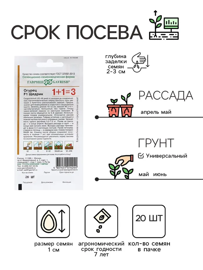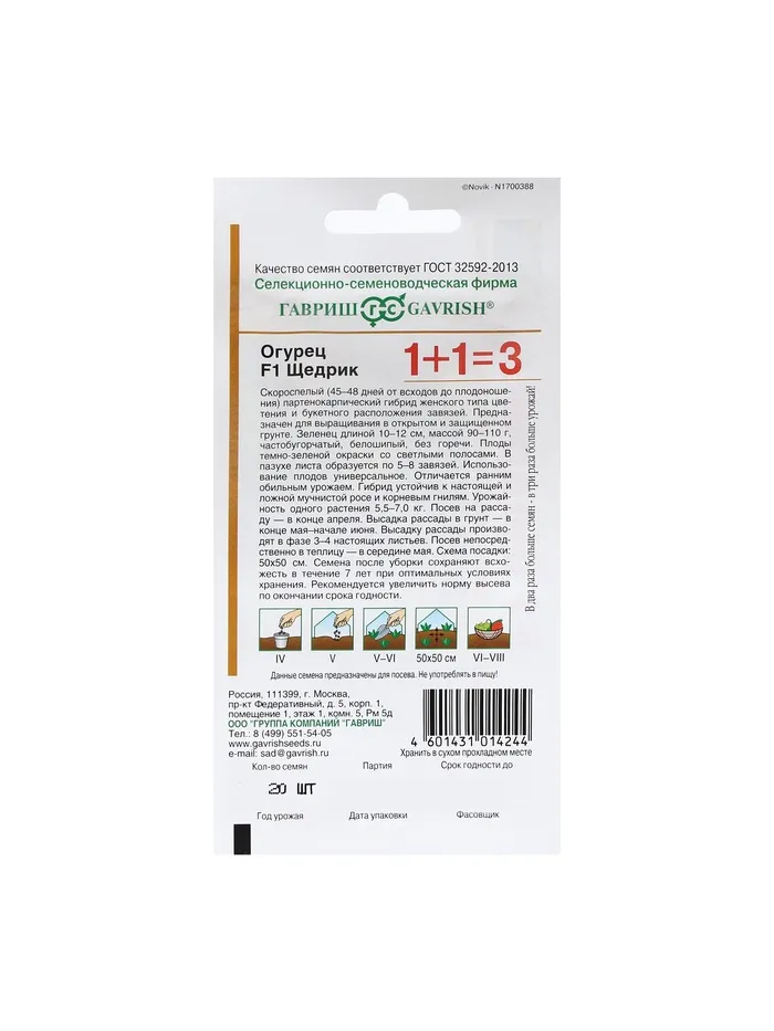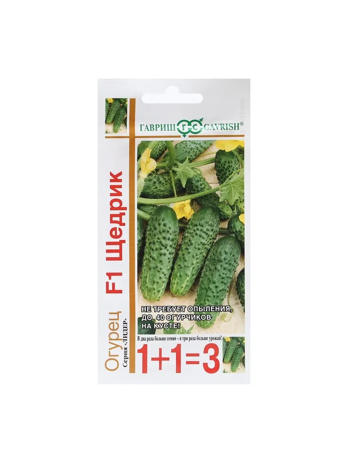 Невероятно урожайный партенокарпический гибрид селекции «Гавриш. Через 45-48 дней, без опыления, специального ухода и частых поливов на растении вырастает 5,5-7,0 кг корнишонов. В узлах закладывается по 5-8 завязей (!) из каждой формируется по зеленцу с частыми бугорками и белым опушением. Сладкие и хрустящие — для салатов, маринования и бочкового посола. Все огурцы селекции «Гавриш» никогда не горчат. Устойчивость к настоящей и ложной мучнистой росе, корневым гнилям гарантирует непрерывное плодоношение до конца лета. Выращивают в открытом грунте и теплицах. Посев на рассаду — в конце апреля. Высадка рассады в грунт — в конце мая-начале июня в фазе 3-4-х настоящих листьев. Посев непосредственно в грунт — в середине мая. Схема посадки: 50х50 см. Семена после уборки сохраняют всхожесть в течение 7 лет при оптимальных условиях хранения. Рекомендуется увеличить норму высева по истечение срока годности.