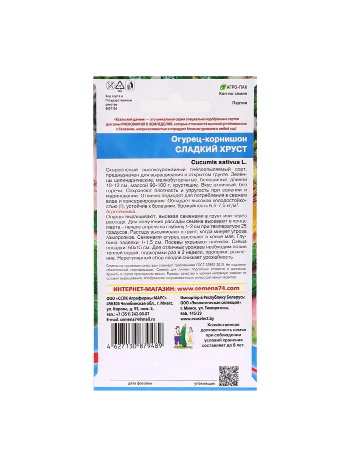 Среднеспелый сорт с необычной окраской плодов и прекрасным вкусом. Плоды цилиндрические, крупнобугорчатые, с черным опушением. Вес каждого корнишона в среднем достигает 60-70 г, длина плода 7-10 см. Отличается ярким, светлым, почти белым цветом, деликатесным вкусом, устойчивостью к мучнистой росе. Прекрасно подходит для консервирования. Агротехника. Посев на рассаду или на постоянное место. Глубина заделки семян 1-2 см. Семена начинают прорастать при температуре 13…15°С. Тепло- и влаголюбив, предпочитает освещенные, защищенные от холодных ветров места с плодородной, легкой почвой. Оптимальная температура для роста 25…30°С. Уход: поливы теплой водой, совмещая их раз в 10 дней с подкормкой, прополки и рыхление.