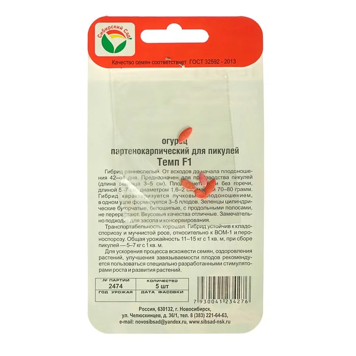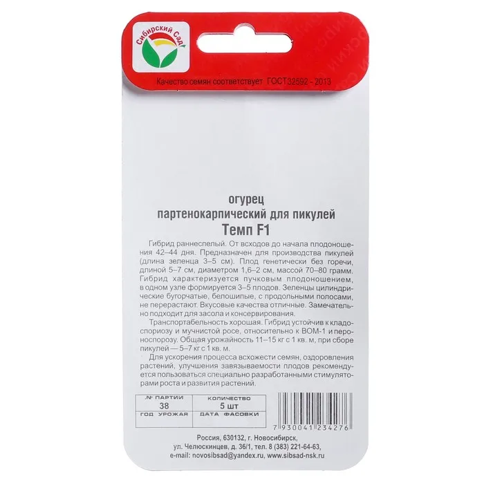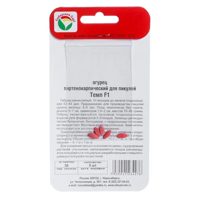 Семена Огурец Темп F1,партенокарпический, 5 шт — Характеристики