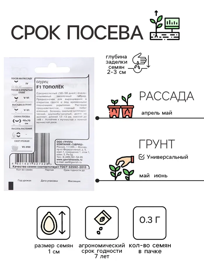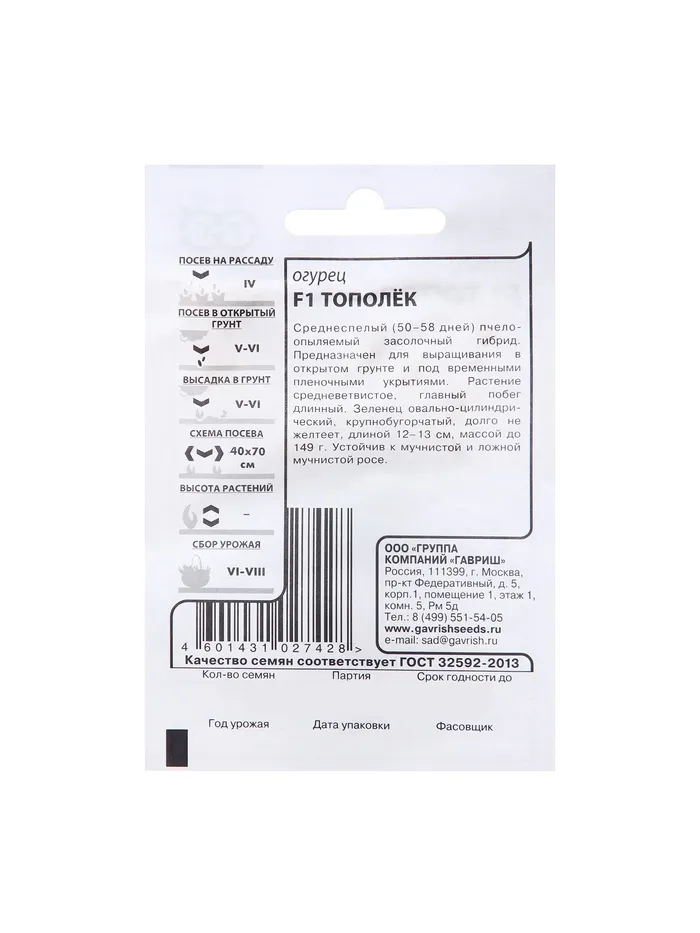 Среднеспелый (50-58 дней) пчелоопыляемый, засолочный гибрид для открытого грунта и пленочный укрытий. Растение сильнорослое, преимущественно женского типа цветения. Зеленец овально-цилиндрический, длиной 12-13 см, крупнобугорчатый, массой 133-149 г. Гибрид холодостойкий, долго не желтеет. Устойчив к оливковой пятнистости, ложной мучнистой росе. Отличные вкусовые качества свежих и консервированных плодов.
