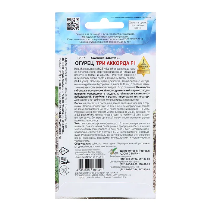 Огурец Аккорд F1 - ранний партенокарпический гибрид, рекомендуемый для пленочных и стеклянных теплиц без обогрева. От всходов до первого сбора 46–47 дней. Растение среднеплетистое, преимущественно женского типа цветения. Зеленец удлиненно-цилиндрической формы, зеленого цвета с расплывчатыми белыми полосами, массой 110–120 г, длиной 11–12 см, диаметром 3,5–4,2 см. В одном узле могут одновременно завязываться по 2 плода. Опушение сложное, редкое, коричневого или черного цвета. Генетически без горечи. Вкусовые качества и товарность отличные. Огурец Аккорд F1 устойчив к мучнистой росе (Px), относительно устойчив к ложной мучнистой росе (Pcu). Рекомендуемая плотность посадки 4 растения на 1 м2. Урожайность в весенних пленочных и остекленных теплицах без обогрева составляет за первый месяц сбора 3,4–5,6 кг/м2, общая 11–15 кг/м2.