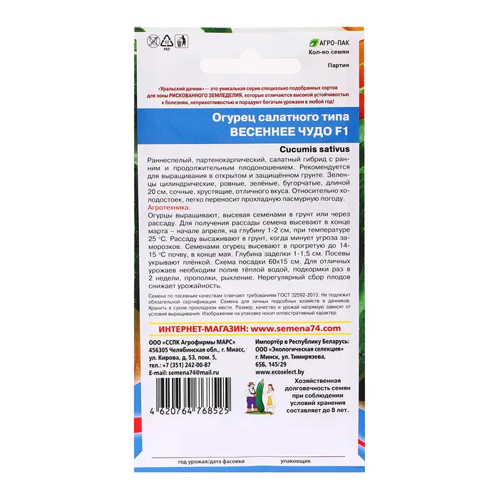 Раннеспелый, партенокарпический, салатный гибрид с ранним и продолжительным плодоношением. Рекомендуется для выращивания в открытом и защищённом грунте. Зеленцы цилиндрические, ровные, зелёные, бугорчатые, длиной 20 см, сочные, хрустящие, отличного вкуса. Относительно холодостоек, легко переносит прохладную пасмурную погоду. Огурцы выращивают, высевая семенами в грунт или через рассаду. Для получения рассады семена высевают в конце марта-начале апреля, на глубину 1-2 см, при температуре 25 градусов. Рассаду высаживают в грунт, когда минует угроза заморозков. Семенами огурец высевают в конце мая. Глубина заделки 1-1,5 см. Посевы укрывают плёнкой. Схема посадки 60х15 см. Для отличных урожаев необходим полив тёплой водой, подкормки раз в 2 недели, прополки, рыхление. Нерегулярный сбор плодов снижает урожайность.