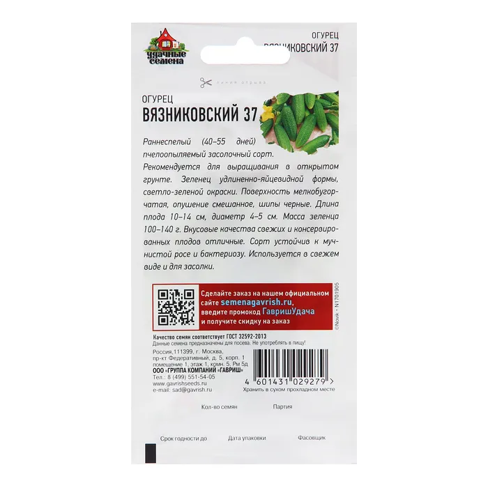 Раннеспелый (40-55 дней) пчелоопыляемый засолочный сорт для открытого грунта. Зеленцы светло-зеленые, мелкобугорчатые, черношипые, длиной 10-14 см, массой 100-140 г. Отличные вкусовые качества как свежих, так и консервированных плодов. Устойчив к засухе и похолоданиям, а также к мучнистой росе и бактериозу.
