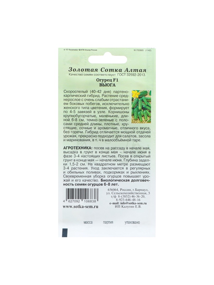 Семена Огурец «Вьюга F1», партенокарпический, 0.15 г, «Золотая Сотка Алтая» — Характеристики