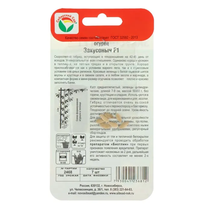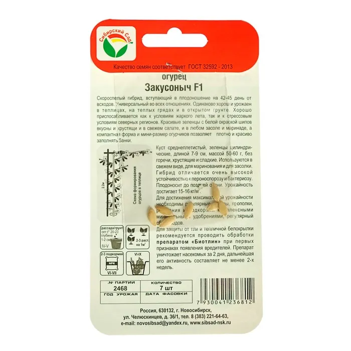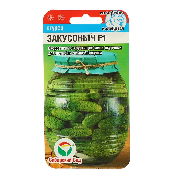 Скороспелый гибрид, вступающий в плодоношение на 42- 45 день от всходов. Универсальный во всех отношениях. Одинаково хорош и урожаен в теплицах, на теплых грядах и в открытом грунте. Хорошо приспосабливается как к условиям жаркого лета, так и к стрессовым условиям северных регионов. Красивые зеленцы с белой окраской шипов вкусны и хрустящи и в свежем салате, и в любом засоле и маринаде, а компактная форма и мини - размер огурчиков позволяет плотно и красиво заполнять банки. Куст среднеплетистый, зеленцы цилиндрические, длиной 7-9 см, массой 50-60 г, без горечи, хрустящие и сладкие. Используются в свежем виде, для маринования и для засолки. Гибрид отличается очень высокой устойчивостью к пероноспорозу и бактериозу. Плодоносит до поздней осени. Урожайность достигает 15-16кг/м2.