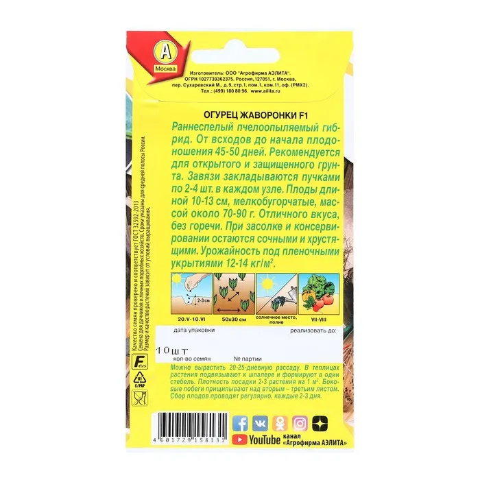 Раннеспелый пчелоопыляемый гибрид. От всходов до начала плодоношения 45-50 дней. Рекомендуется для открытого и защищенного грунта. Завязи закладываются пучками по 2-4 шт. в каждом узле. Плоды длиной 10-13 см, мелкобугорчатые, массой около 70-90 г. Отличного вкуса, без горечи. При засолке и консервировании остаются сочными и хрустящими. Урожайность под пленочными укрытиями 12-14 кг/м2.