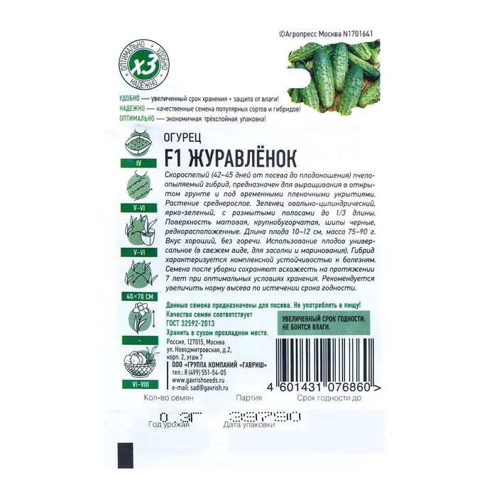 Семена Огурец "Журавленок" F1, скороспелый, пчелоопыляемый, 0,3 г серия ХИТ х3 — Характеристики
