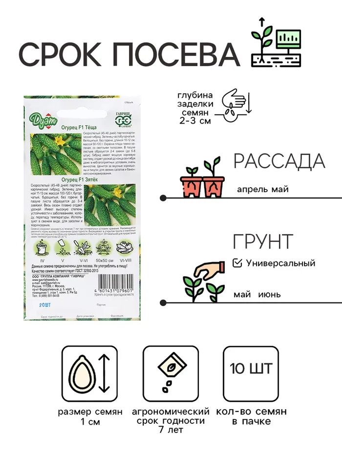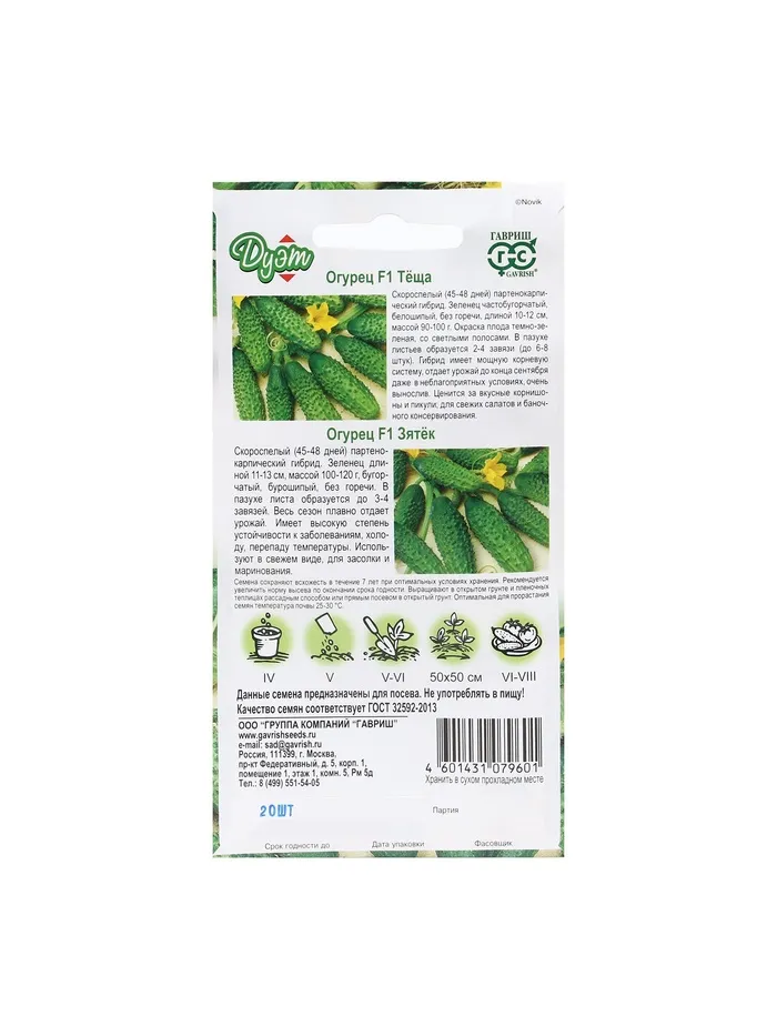 Скороспелый (45-48 дней) партенокарпический гибрид. Зеленец частобугорчатый, белошипый, без горечи, длиной 10-12 см, массой 90-100 г. Окраска плода темно-зеленая со светлыми полосами. В пазухе листьев образуется 2-4 завязи (до 6-8 штук). Имеет мощную корневую систему, интенсивный рост, отдает урожай до конца сентября даже в неблагоприятных условиях, очень вынослив. Ценится за вкусные корнишоны и пикули, пригодные для баночного консервирования. Огурец Теща: Скороспелый (45-48 дней) партенокарпический гибрид. Зеленец длиной 11-13 см, массой 100-120 г, бугорчатый, бурошипый, без горечи. В пазухе листа образуется до 3-4-х завязей. Весь сезон плавно отдает урожай. Имеет высокую степень устойчивости к заболеваниям, холоду, перепаду температуры. Используют в свежем виде, для засолки и маринования.
