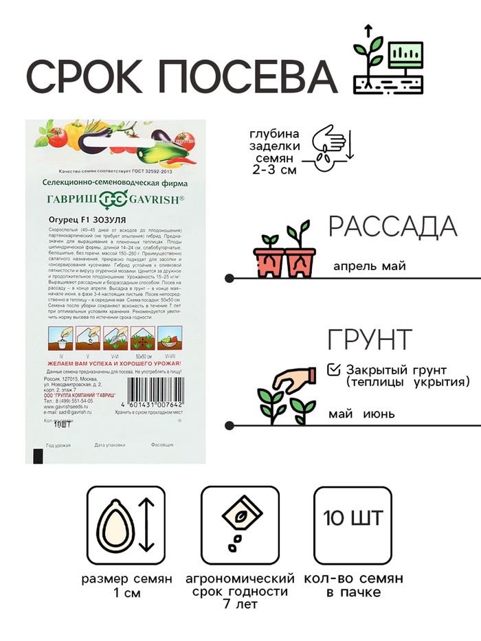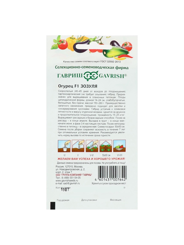 Скороспелый (вступает в плодоношение на 45-50 день от всходов) пчелоопыляемый гибрид с частичной партенокарпией, женского типа цветения. Предназначен для выращивания в пленочных теплицах. Растение среднеплетистое, ветвление слабое. Посев на рассаду в конце апреля. Высадка в грунт в конце мая - начале июня в фазе 3-4-х настоящих листьев. Посев непосредственно в теплицу - в середине мая. Схема посадки 50х50 см. Плоды цилиндрической формы, длиной 14-24 см, слабобугорчатые, белошипые, без горечи. Преимущественно салатного назначения, молодые зеленцы прекрасно подходят для засолки. Отличается дружным плодоношением. Гибрид устойчив к оливковой пятнистости и вирусу огуречной мозаики. Урожайность до 40 кг/м2.