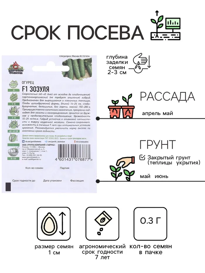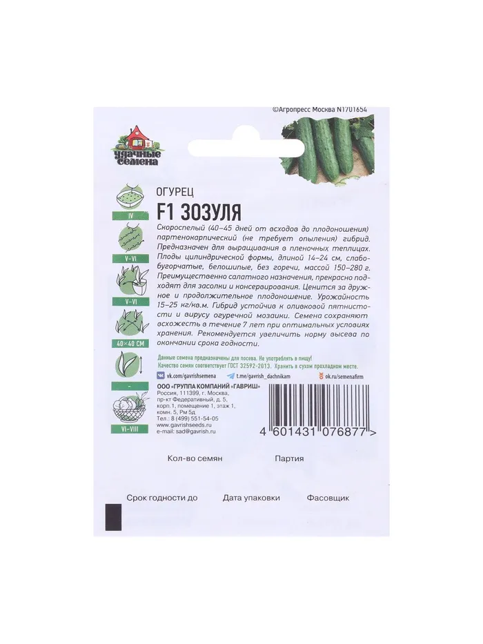 Скороспелый (вступает в плодоношение на 45-50 день от всходов) пчелоопыляемый гибрид с частичной партенокарпией, женского типа цветения. Предназначен для выращивания в пленочных теплицах. Растение среднеплетистое, ветвление слабое. Посев на рассаду в конце апреля. Высадка в грунт в конце мая - начале июня в фазе 3-4-х настоящих листьев. Посев непосредственно в теплицу - в середине мая. Схема посадки 50х50 см. Плоды цилиндрической формы, длиной 14-24 см, слабобугорчатые, белошипые, без горечи. Преимущественно салатного назначения, молодые зеленцы прекрасно подходят для засолки. Отличается дружным плодоношением. Гибрид устойчив к оливковой пятнистости и вирусу огуречной мозаики. Урожайность до 40 кг/м2.