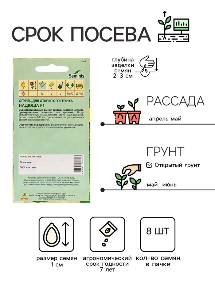 Посев на рассаду осуществляется в марте, мае и ноябре, а в грунт — в марте, апреле и мае. Гибрид сохраняет свой агрономический срок годности в течение 7 лет, поэтому можно планировать посадки на несколько сезонов вперёд.