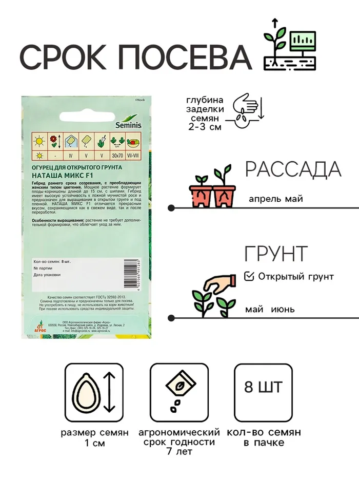 Агрономический срок годности семян — 7 лет, что позволяет хранить их без потери качества. Это выгодное приобретение для длительного использования и для тех, кто сеет огурцы многолетними партиями.