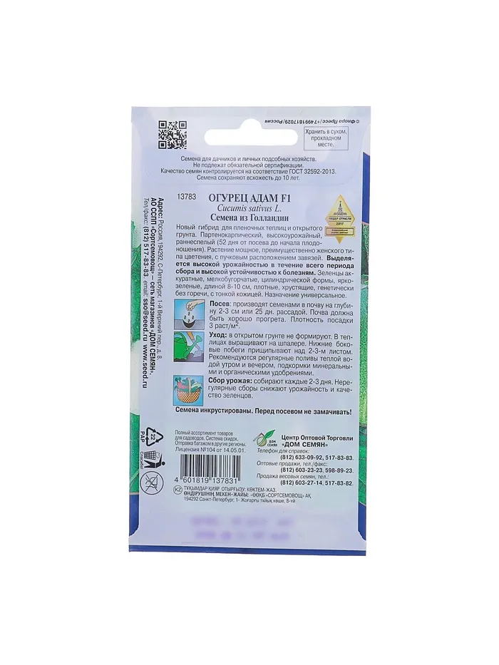 Партенокарпический, раннеспелый, 52 дня от всходов, высокоурожайный гибрид. Букетный тип завязи. Для пленочных теплиц. Зеленцы мелкобугорчатые, ровные, 8-10 см, без горечи. Для всех видов переработки. я настоящих листьев. Схема посадки в грунт – 60х15 см. Сорт очень отзывчив на плодородие почвы, солнечный свет и тепло. Рекомендованная температура для посева +18–26 °C. Допускается посев в открытый грунт и пленочные теплицы.